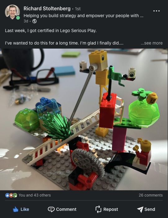 Play sparks imagination and coming up with narratives. Everyone is a storyteller. And stories are 22x more ‘sticky’ than the most compelling fact – so what you come up with is more enduring.